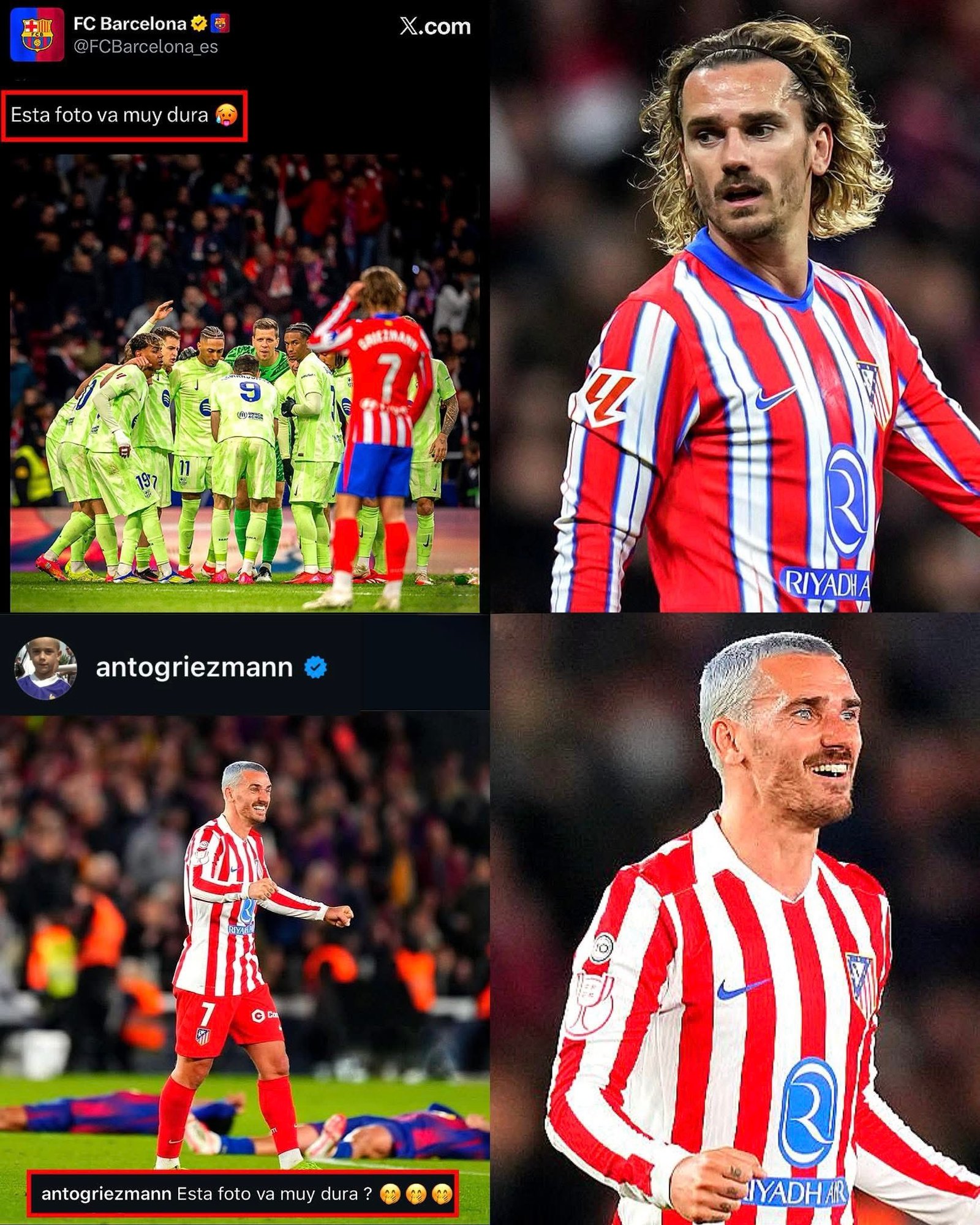 Esta temporada, los dos equipos ya se han encontrado en fases avanzadas de otro torneo, la Copa del Rey. Los de Simeone salieron victoriosos de la eliminatoria tras hacer bueno el 4-0 de la ida en el Riyadh Air Metropolitano. Los pupilos de Flick rozaron la heroicidad en la vuelta, pero se quedaron a las puertas de la remontada con el 3-0 final en el Spotify Camp Nou. La eliminatoria permitió ver dos versiones muy opuestas de ambos equipos. En redes sociales, tras eliminar a su exequipo, Antoine Griezmann se acordó de un tuit anterior de la cuenta oficial azulgrana con la frase “Esta foto va muy dura” donde aparecía él cabizbajo y no dudó en replicar el comentario con una imagen similar. Este enfrentamiento ya se considera un clásico del fútbol español y la rivalidad entre ambos equipos no ha dejado de aumentar.
