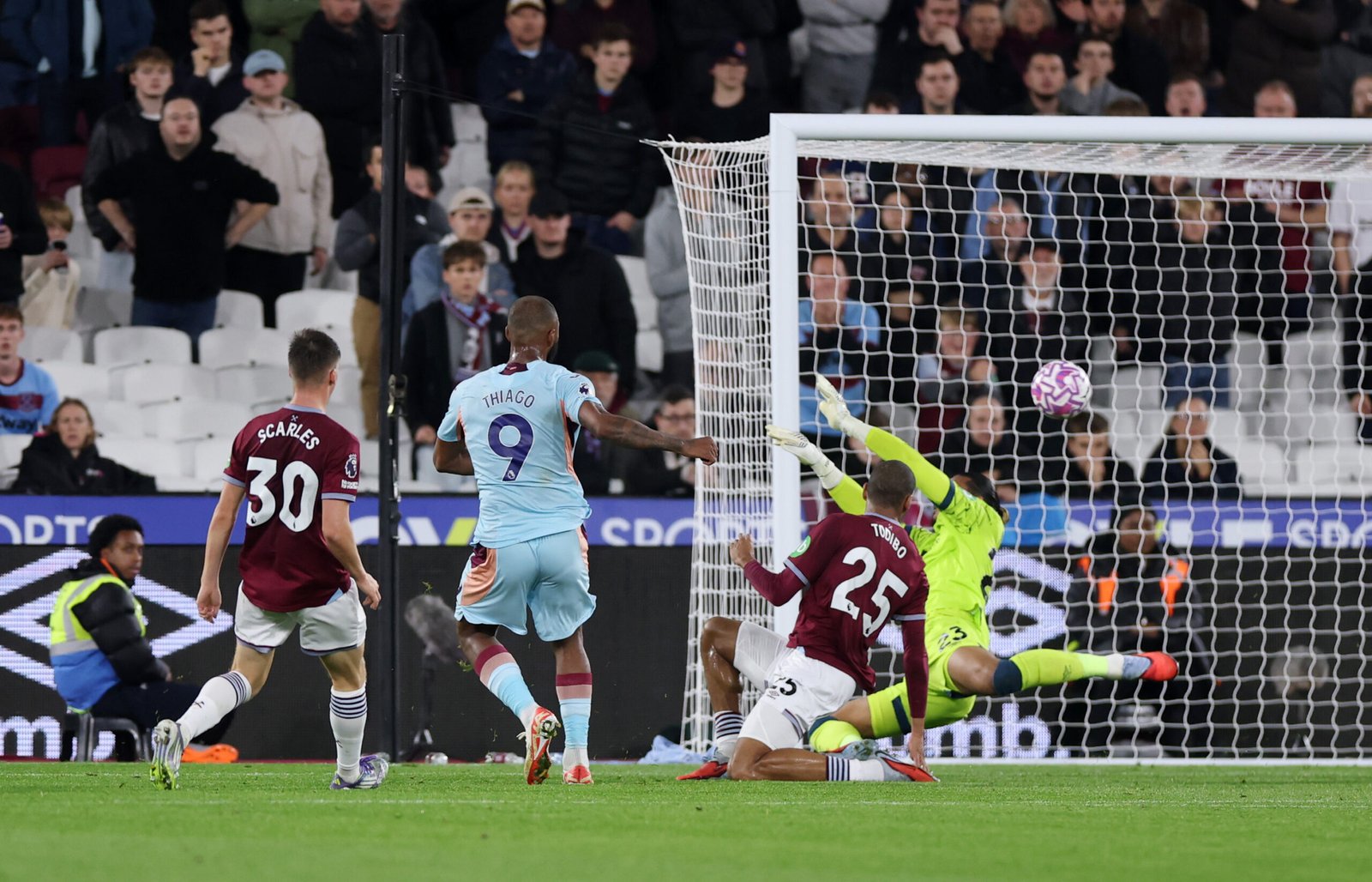 Con el paso de los minutos, los ‘Hammers’ fueron perdiendo protagonismo, mientras que los ‘Bees’ se adueñaban del balón y acumulaban ocasiones, llegando a forzar siete saques de esquina. El premio a su insistencia llegó en el minuto 42: un balón largo fue controlado por Schade, quien asistió a Thiago. El brasileño remató y, pese a la estirada de Areola, el balón terminó dentro de la portería. El Brentford se marchó al descanso con un 0–1 que dejó tocado al cuadro londinense. En la última acción del primer tiempo, los visitantes incluso marcaron un segundo tanto, aunque fue anulado por fuera de juego.